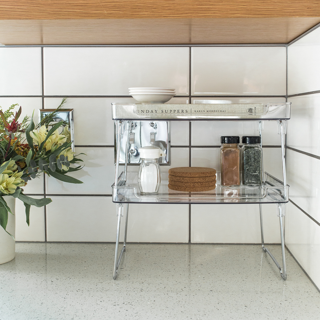 - Sturdy solid shelf with raised sides.